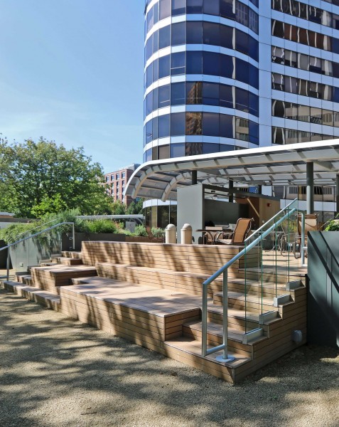 The American Plaza Towers in Southwest Portland share a below grade three-level parking garage with surface parking on the roof.