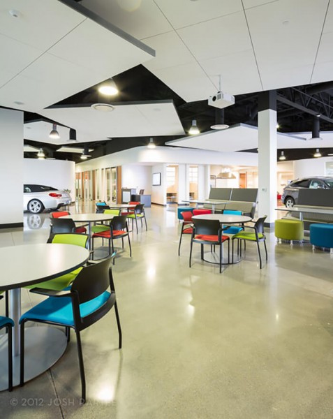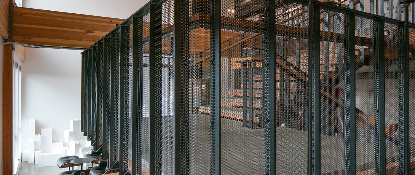 The office capitalizes on a historic method of construction design, combined with modern day building codes and design sensibilities. Wood, glass, steel and concrete are used prominently throughout. Timber construction framing and exposed glue-laminated timber beams dominate the space, and concrete floors provide a modern, urban aesthetic.