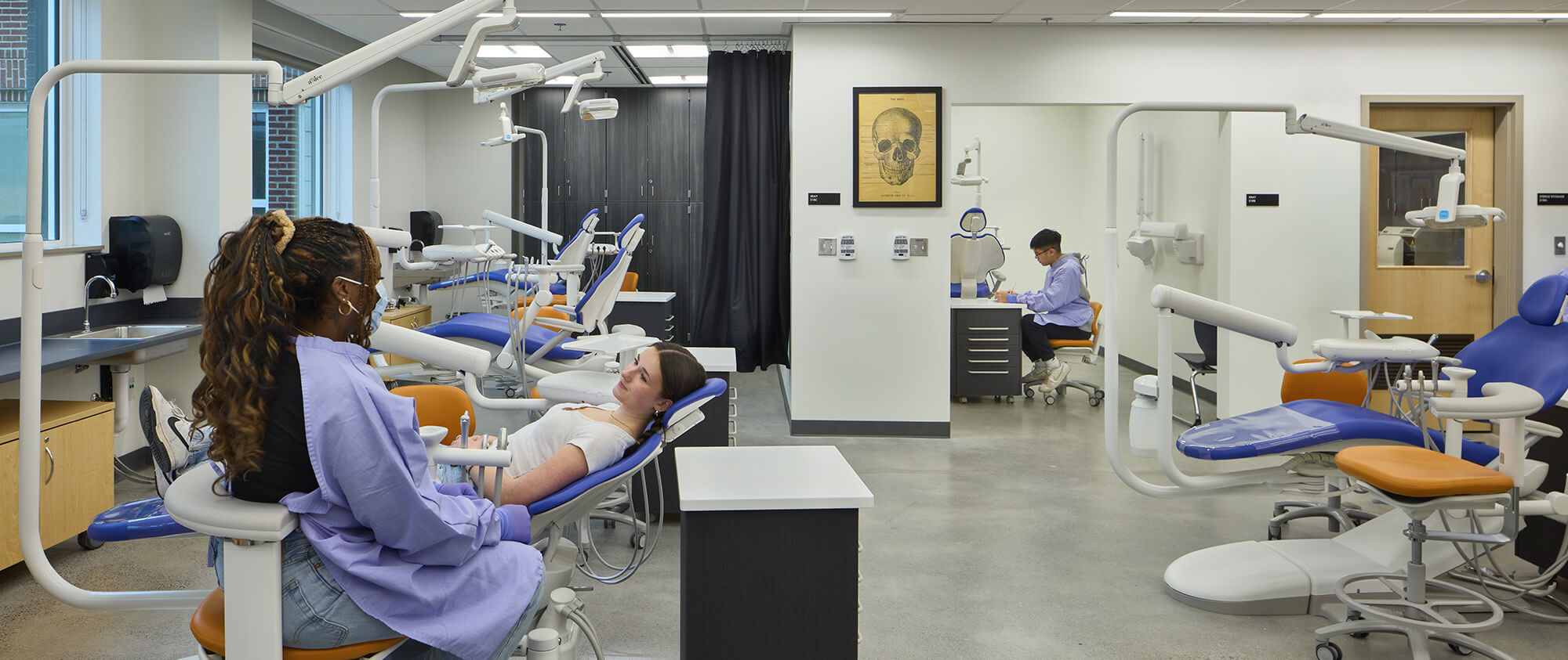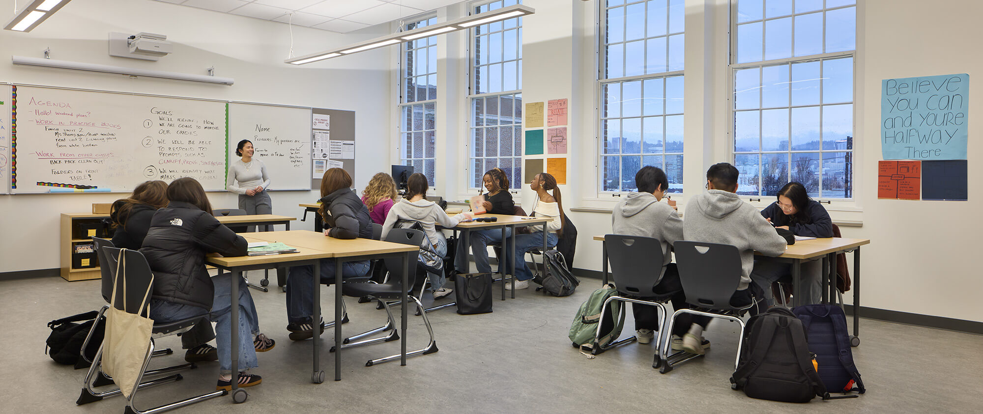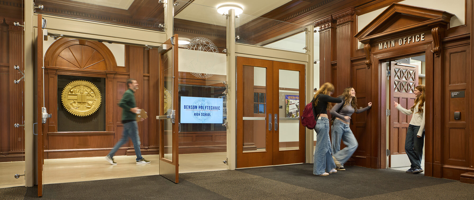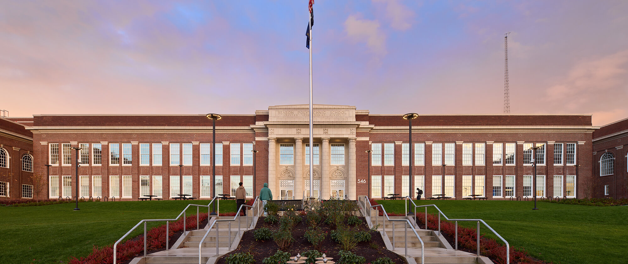 The modernization of Benson Polytechnic restores the historic Main Classroom building, Old Gymnasium, Auditorium Building, and Foundry Building. Renovations also include the Gym, Radio Building, and library and health services addition. New construction includes a Commons/central classroom/kitchen addition, 2 story north and south CTE and classroom wings and site improvements. The project features 230,000 SF of historically significant renovation and 135,000 SF of new construction. Internal layouts of core academic classrooms and CTE programs provide adjacencies that promote shared resources and learning that does not currently exist. The design reinvigorates Benson Polytechnic as a national model for career learning-based education. Benson is LEED Platinum certified.