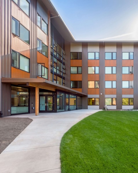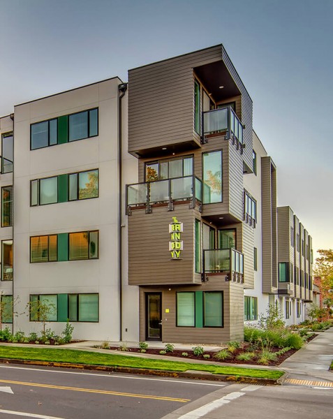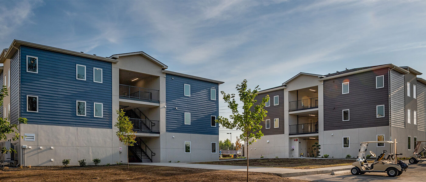 Unique repurpose of shipping containers form this two-building, 54-unit student housing project.