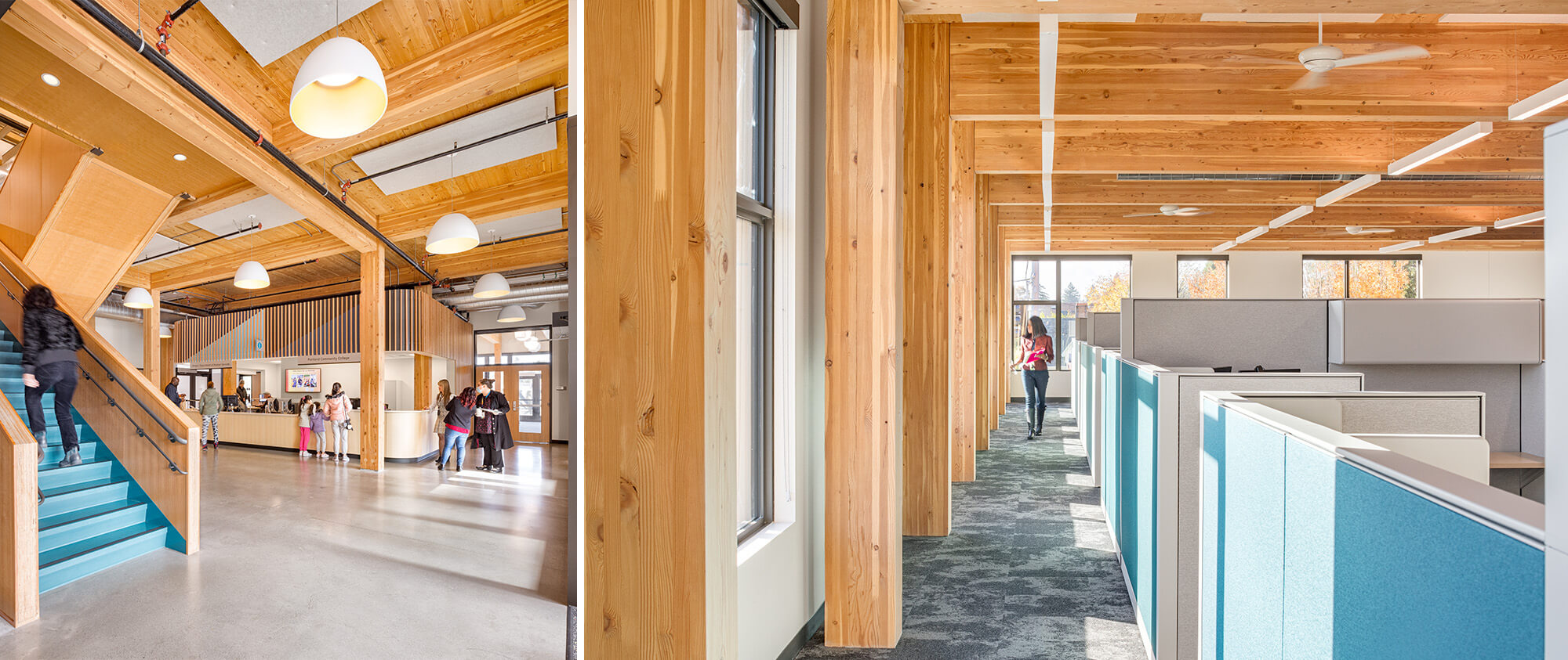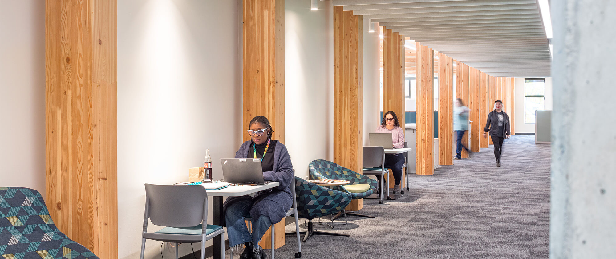 The new PCC Opportunity Center @42nd Ave, located in NE Portland, underwent redevelopment, which included the demolition of two existing buildings and the construction of a new 50,000-square-foot facility. Includes classrooms, meeting rooms, event space and offices, and includes space for the Oregon State Department of Human Services to support a new integrated service model for clients of PCC's Workforce Development.