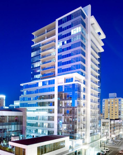 The project features 104 high-end residential units, including 3 live/work units and 6 townhouse units, constructed within a concrete post-tensioned slab building over 3.5 levels of underground parking, housing 200 parking stalls. Exterior cladding of the building features calcium silicate masonry units, brick and composite metal panels. This project is certified LEED Silver.